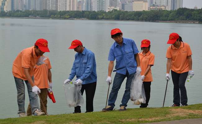 圖二:入黨積極分(fèn)子們在南湖(hú)進(jìn)行垃圾清理