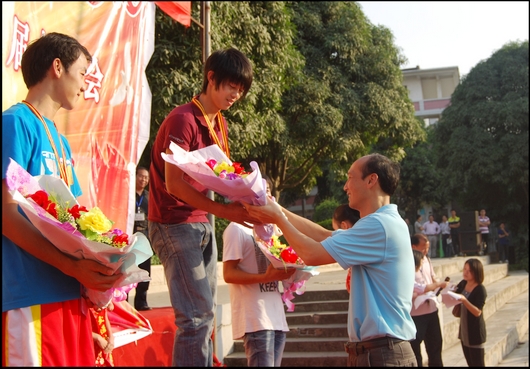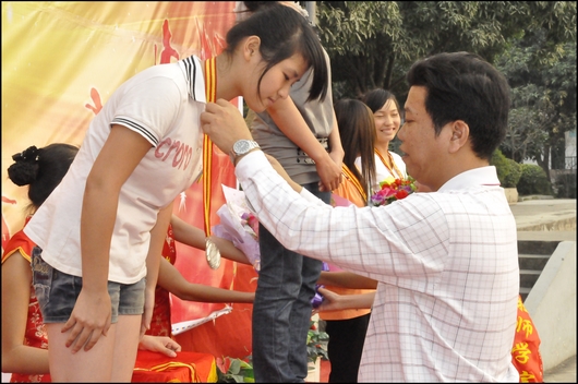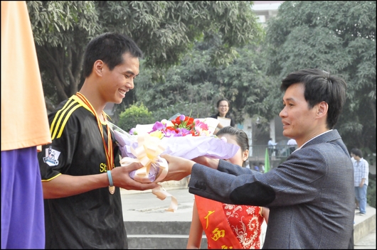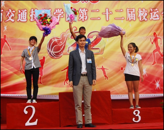 本屆運動(dòng)會共(gòng)計有63人次獲得各個人項目的前三名。10技師一班(bān)、10高中一班和09檢高9班獲得了男(nán)子團體總分前三名。11電(diàn)腦財會班、10高速班和11高速一班獲得了女子團(tuán)體總分前三名。11高速一班等(děng)12個班級獲得道德文明風尚獎。我校韋紅教校(xiào)長、鍾修(xiū)仁副校長、關菲明副校長及其他領導(dǎo)為獲獎選手頒獎。