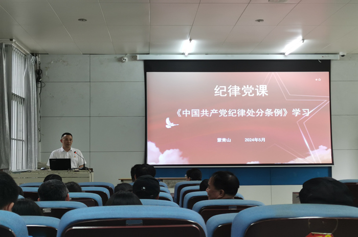 為深入(rù)貫徹學習新修(xiū)訂的《中國共產黨紀律處分條例》,進一步教育引導黨員切實做到“學紀、知紀、明紀、守紀”,5月29日下午(wǔ),信息工程係黨支部在求學樓階梯教室開展《中國共產黨紀律(lǜ)處分條例》學習教育(yù)專題黨課,學院紀委書(shū)記蒙青山主講,信息工程係黨支部書(shū)記羅莎主(zhǔ)持。