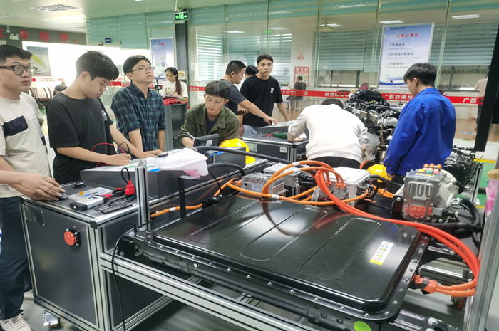 來自全區職業院校與企業的參賽代表隊總計48人參加了本次技術培訓(xùn)會,培訓現場,各參(cān)訓(xùn)隊伍熱情高漲,相互學習,積極探討。據悉,該賽項由深圳市愛夫(fū)卡(kǎ)科技股份有限公司根據新能源汽(qì)車產業發展趨勢,以(yǐ)五菱增程混動新能源汽車為(wéi)原型,圍繞新能源汽車混合動力係(xì)統、氫燃料動力係統等(děng)節能減排技術進行賽項設計(jì)。