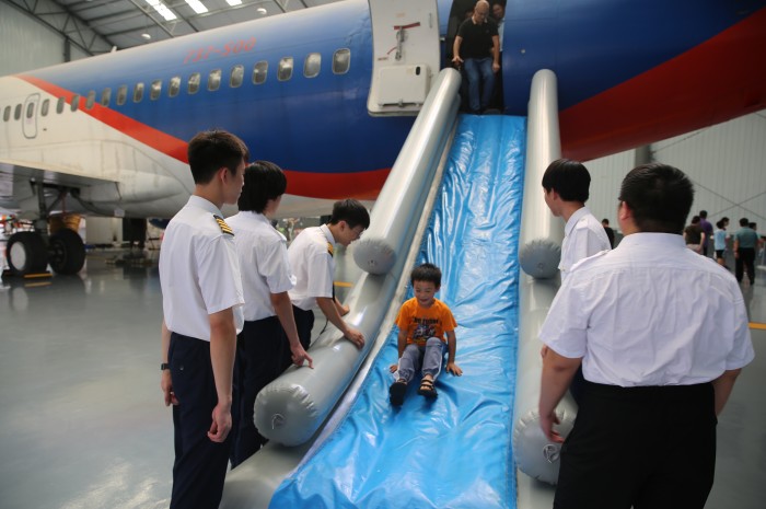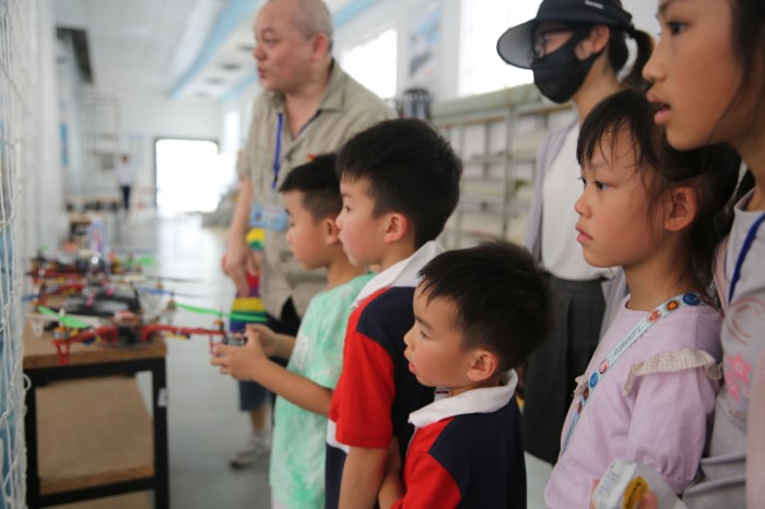 在民用航空係教師的帶領下,教職工子女們來到了學院的民用航空實訓基地,分組開展研學活動。孩子們先通過觀(guān)看視頻(pín)學習民航的基礎知識,隨後參加民航知識有獎問答、固定翼和旋翼飛機觀摩(mó)、機下+發動機介紹、波音737飛(fēi)機駕駛艙體驗、客艙應急逃(táo)生演練、無(wú)人機飛行體驗等(děng)多項充滿趣味的活動。