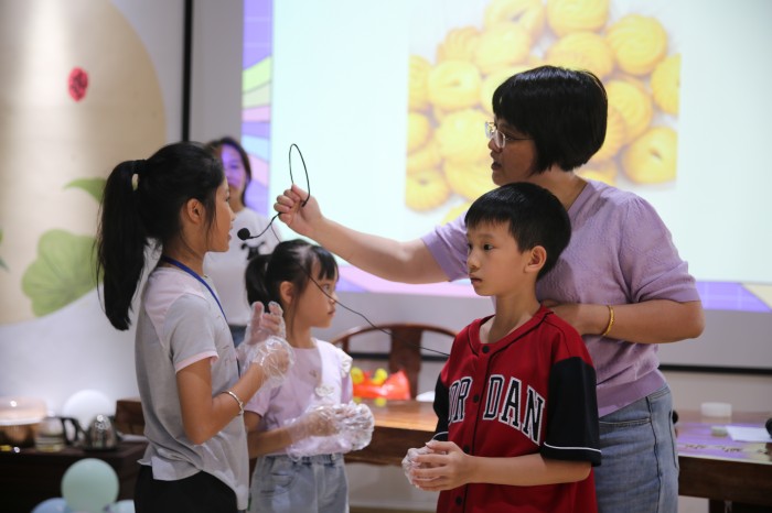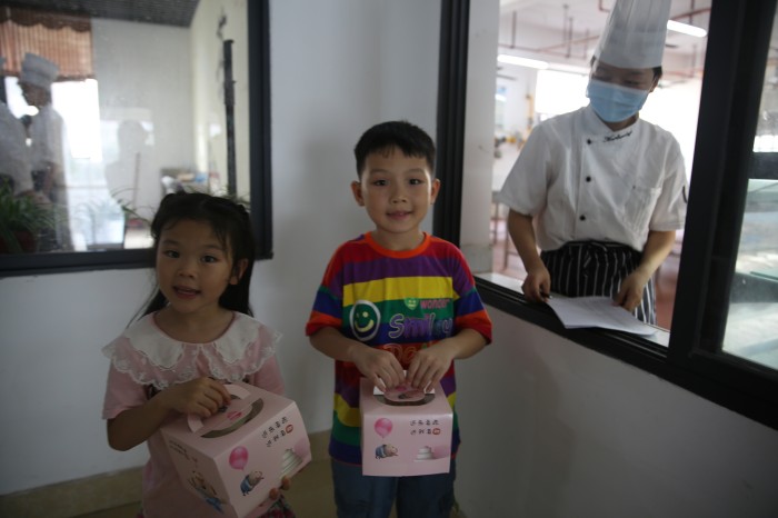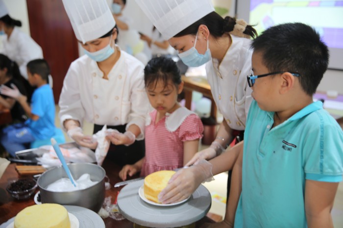 隨後,孩子們來到了商務(wù)服(fú)務係的茶藝室進行DIY蛋糕(gāo)研學活動。幼兒教育專(zhuān)業的師生帶領孩子們唱歌熱身,商務服務係主任陸向華作“快樂童年 健康飲食”小講座。