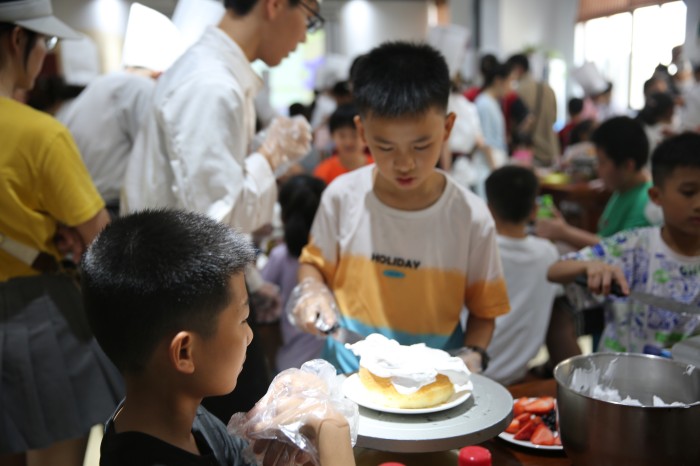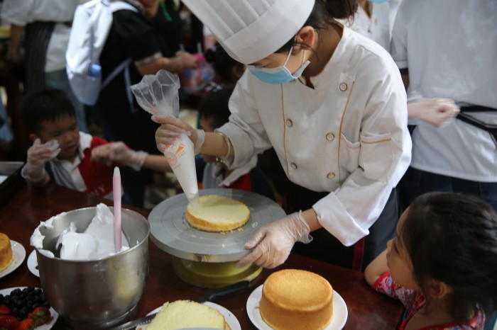講座結束後,師生就蛋糕製作的工藝流(liú)程,食材取量及操作工具等要點逐一對(duì)孩子們進行講解與操作示範,熱心家長也紛紛(fēn)出謀劃策,現(xiàn)場氛圍火熱。孩子們開始握刀、抹平奶油(yóu)等,逐漸掌握技巧,有模有樣地製作起了蛋糕。