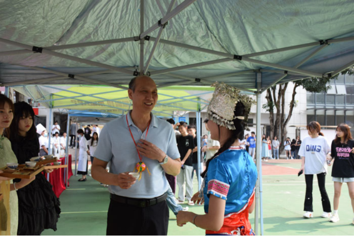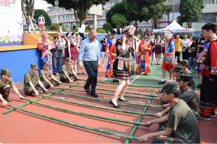 學院副院長黃七零和學生一起體驗竹竿舞活動