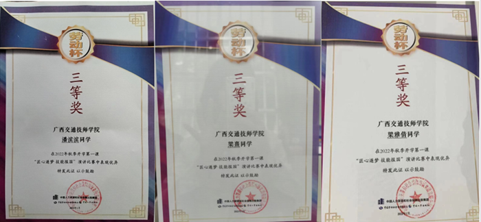 中國人力資源和社會保障出版集團於2022年9月(yuè)-12月舉辦了“匠(jiàng)心逐夢 技能報國”演講比賽(sài)視頻征(zhēng)集活動,我院交通工程(chéng)係潘(pān)濱濱同學(指導(dǎo)老師:謝少林)、梁雅倩同學(xué)(指導老師:徐寅彪)和商務(wù)服務係梁熹同學(指導老師:黃(huáng)煒)3人均在比賽中榮獲了三等獎的佳績。