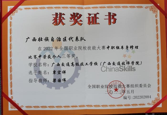 【強國複興有我】我院覃宏祥同學(xué)榮獲2022年全國職業院校技能大賽(中(zhōng)職(zhí)組(zǔ))車(chē)身修理賽項三等獎