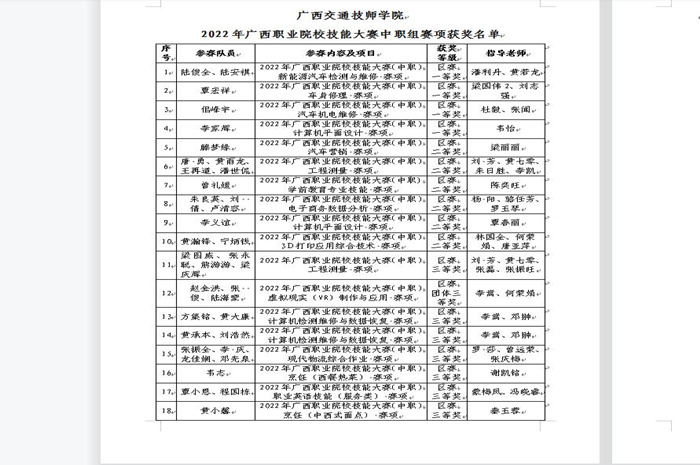 本次大賽學院共組織23個參賽隊參賽,經過激烈角逐,我(wǒ)院比賽團隊在眾多參賽隊(duì)中脫穎而出,共計(jì)17個參賽隊獲獎,其中獲一等獎(jiǎng)4項、二等(děng)獎6項,三等獎7項。汽車工程係“汽車機電(diàn)維修”“車身修理”“新能源汽車檢測與維修”3個(gè)賽項代表廣西進入國賽,參加全國職業院校技能大賽。