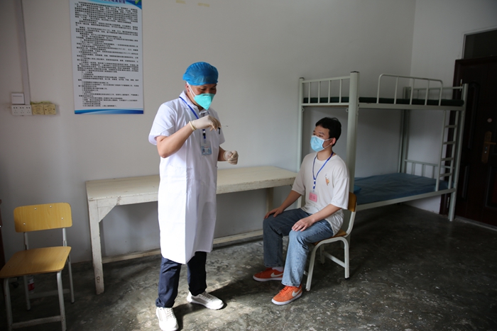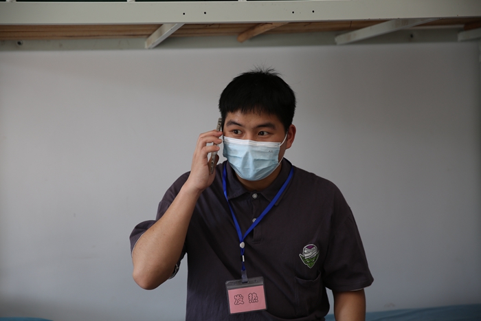 校醫在臨時隔離(lí)留觀區詢問體溫異常學生的症狀和流行病學史