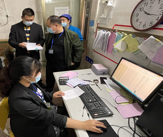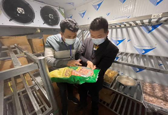檢查組查看食堂冷鏈食品(pǐn)的檢驗檢疫合格證