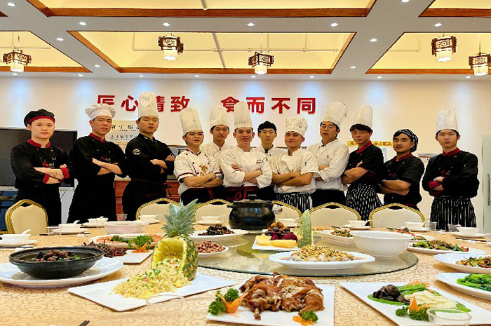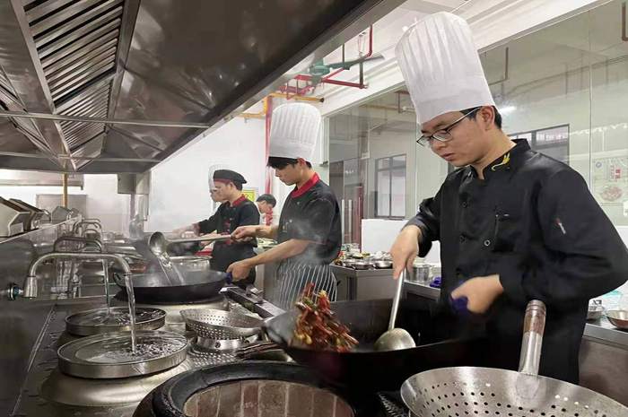 2017級中式烹飪專業高(gāo)級工班的學生經(jīng)過五年(nián)曆練,通(tōng)過以中式烹調工藝為核心,向中式麵點(diǎn)、果蔬雕刻與冷拚發(fā)展的一專多(duō)能的專業訓練,綜合職業能力得到有效提(tí)高。此次畢業盛宴暨綜合實訓項目從飲食成本核算(suàn)、菜單設計、食材采(cǎi)購到菜肴烹飪(rèn)整個實訓過程,由學生親自設計與操作。學生通過親(qīn)自實踐與體驗,把所(suǒ)學的餐飲理論知識與後廚實踐工(gōng)作有效結合,明確後廚工作的流程,提高學(xué)生的職業體驗感和獲得感。