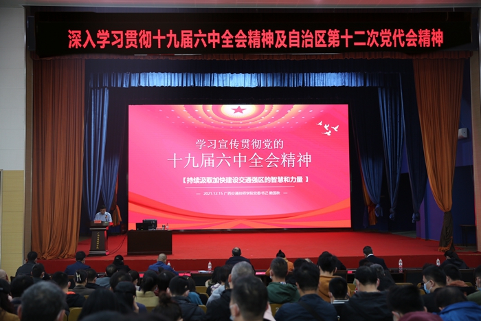 賴國秋立足學院工(gōng)作實際和自身的學習感悟,依據黨的十九屆六中全會精神宣講提綱,從(cóng)深(shēn)刻領會學習黨的百年(nián)奮鬥重大成就和曆史(shǐ)經驗,深刻認識黨的百年奮鬥(dòu)曆史的初心使命和偉大成就,深刻認識中國特(tè)色社會(huì)主義新時代的曆史性成就和曆史性變革,深刻認識黨的百年奮鬥的曆史意(yì)義和曆史經驗,深刻(kè)認識以史為鑒(jiàn)、開創未來的要求,以及從黨的百年奮鬥曆程中汲取智慧和力量等六個方麵對黨的十九屆六中全會的新思想(xiǎng)、新觀點、新(xīn)要求做了分析和詳細解讀,引導全院教職工進一步學習領會黨的十九屆六中全會精神,深刻理解和準確把握中國共產黨百(bǎi)年奮鬥的曆史意義和曆史經驗。同時,賴國秋還傳達了自治區第十二次黨代(dài)會精神,全麵闡述了建設(shè)新時代中(zhōng)國特色社會主義壯(zhuàng)美(měi)廣西(xī)“1+1+4+3+N”目標任務體係,重點講述了精品欧美一区二区在线看片運輸取得輝煌成績和未來發展的規劃藍圖,全麵分析了學院麵臨的機(jī)遇和挑戰,提出了全力推動(dòng)新時代學院高質量發展的具體做法。