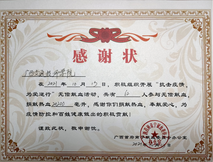 為深入貫徹落實習(xí)近平總書記在黨史學(xué)習教(jiāo)育動員大會上的重要講話精神,以實際行動助推黨史(shǐ)學習教育走深(shēn)走實。10月13日,我院聯合南寧市中心血站開(kāi)展“我為祖國獻熱血 我為黨旗添光彩”為主題的愛心獻血活(huó)動(dòng),廣大師(shī)生踴躍報名參加,最終共有62人參加,獻血量達20200毫升。