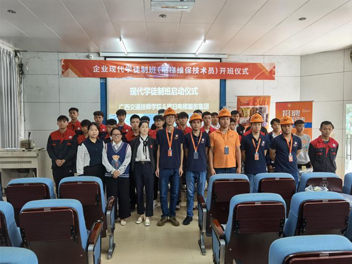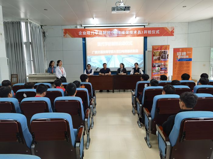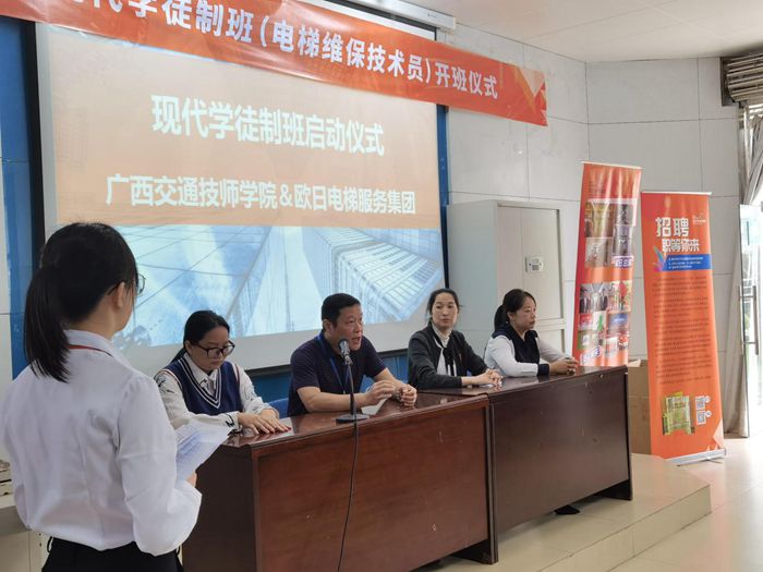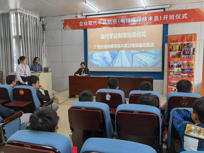 1011日上午,我院機電工程係與廣西歐日電梯服務集團有限公司(sī)校企合作的歐日電梯現代學徒製訂單班開班儀(yí)式在邕(yōng)武校區求知樓階(jiē)梯教室順利舉行。機電工程係主任(rèn)周(zhōu)茂傑,歐日(rì)電梯公(gōng)司維保事業部總(zǒng)經理張巍慰、人事部經理魏紅梅(méi)出席開班儀式,歐日電梯維保訓練團隊和訂(dìng)單班學(xué)生共計(jì)33人參加儀式。