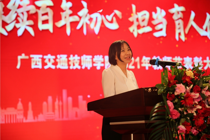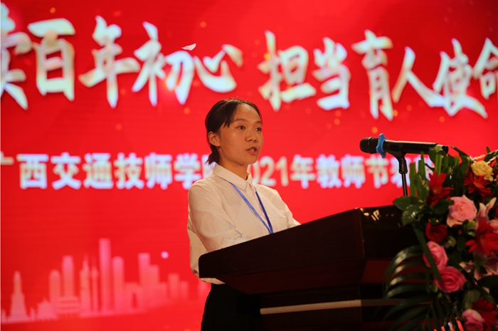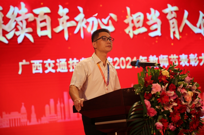 第七屆廣西技工院校專業(學科)帶頭人(rén)、自(zì)治區(qū)級技能大師羅宗港(gǎng)老師和全國技工院校教師職業能力大賽廣西(xī)選拔(bá)賽(sài)一等獎獲得者覃春(chūn)麗老師分別上台發言,紛紛感謝(xiè)學院為教(jiāo)師成長搭建大(dà)平台,使他們能夠充(chōng)分施展才華和本領,表(biǎo)示將銘記自治區交通(tōng)運(yùn)輸廳(tīng)、學院領導的殷切期望(wàng),不忘(wàng)教師立德樹人之初心,牢記教書育(yù)人之使命,承載起學院(yuàn)領導和學生家長的囑托與希望,履職盡責,引導關愛學生,傳道授業解惑,為培養交通(tōng)運輸(shū)行業高技(jì)能人(rén)才(cái)而不懈努力。2021年新入職的教師代表李思穎老師表示,將在今後的(de)教學生涯中,多向優秀教師和優秀教育工作者們學習,將個人發展與學院(yuàn)發展結合起來,充分利用好各(gè)項政策和平台,奮發有為、奮勇前行,為學院高質量(liàng)發展貢獻自己的力量。