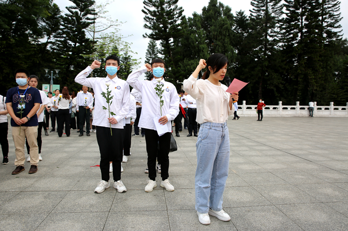 “我誌願加入中國共產黨,擁護黨的綱領,遵守黨的章程(chéng)......”在(zài)革命烈士紀念(niàn)碑(bēi)前,麵對鮮紅的中國共產黨黨旗,黨員代表舉(jǔ)起右手,緊握拳(quán)頭,在學院黨委副書記、紀(jì)委(wěi)書記韋昌(chāng)甲同誌的領誓下,重溫(wēn)入黨誓詞(cí)。以堅定有力的宣誓聲,表達時刻不忘初心,矢誌奮鬥的信念和決心。