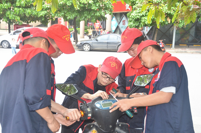 誌願者們專心致誌進(jìn)行電動(dòng)車維修