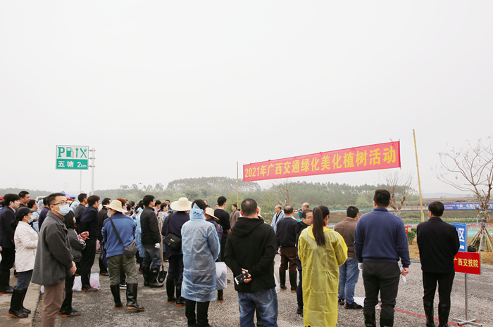 植樹活動(dòng)現場,自治區交通運輸廳副廳長韋勇球(qiú)作講話。他表(biǎo)示,2021年是(shì)中(zhōng)國共產黨成立100周年,是開啟全(quán)麵建設社會主義現代化國家新征程的第一年,是“十四五”開(kāi)局(jú)之(zhī)年,我區交通(tōng)綠化美化工作(zuò)要認真踐行習近平生態文明思想,按照“建設壯美廣西、共圓複興夢想”的總目標總要(yào)求,以“起步就要提速、開局就要爭先(xiān)”的奮鬥姿態,紮(zhā)實推進綠色交通建設,為我(wǒ)區營造山清水秀(xiù)的自然生態做好先行、提供保障。
