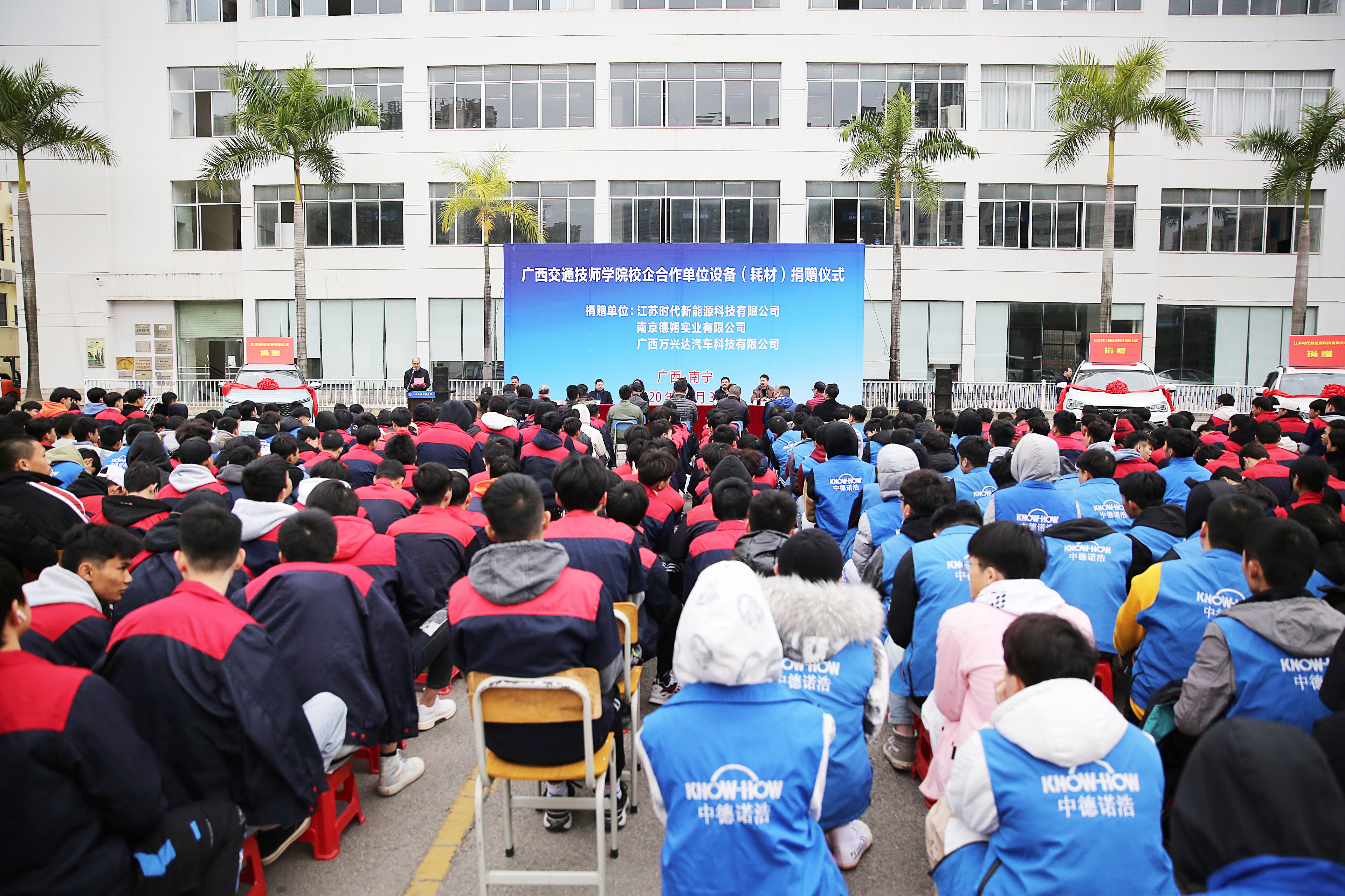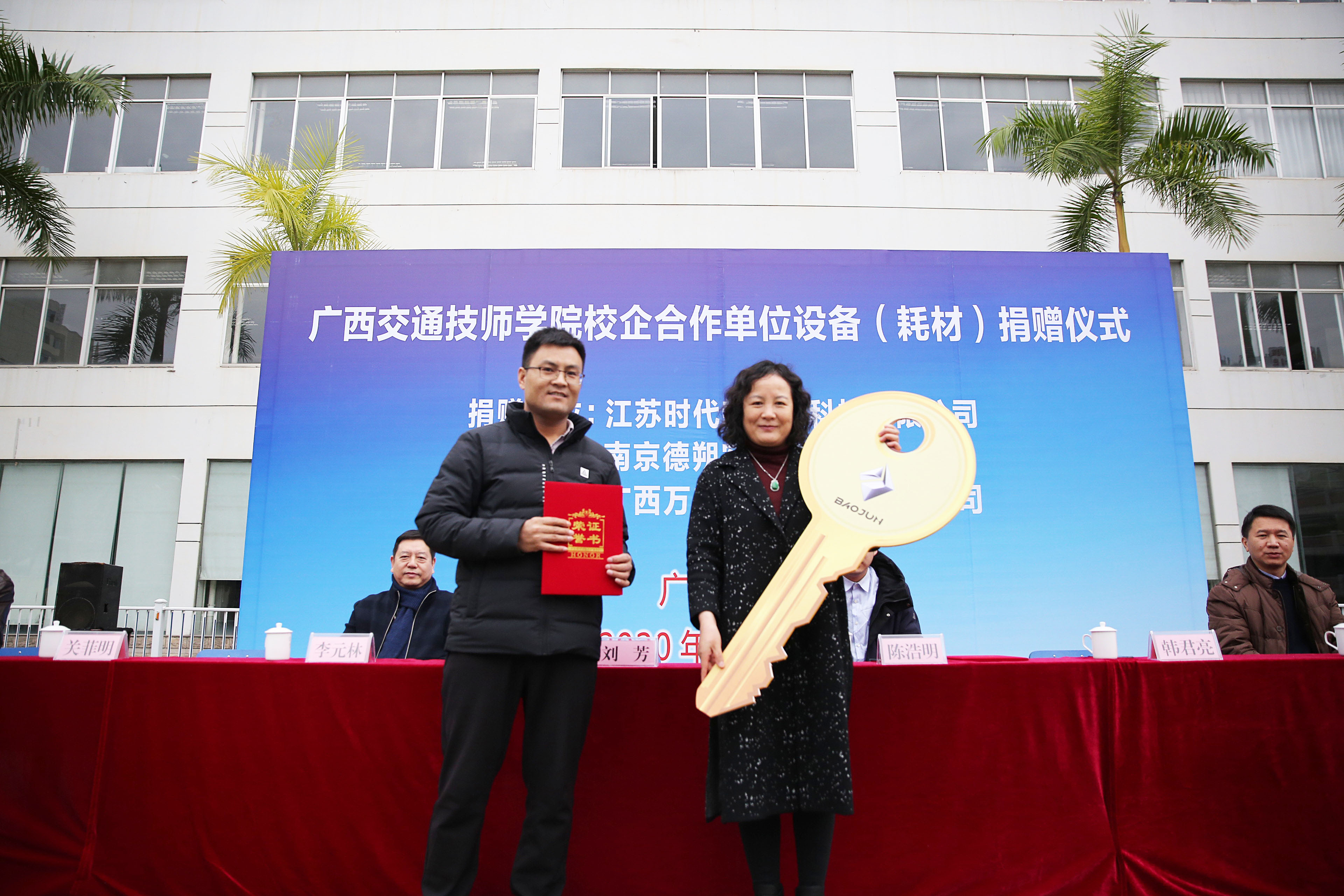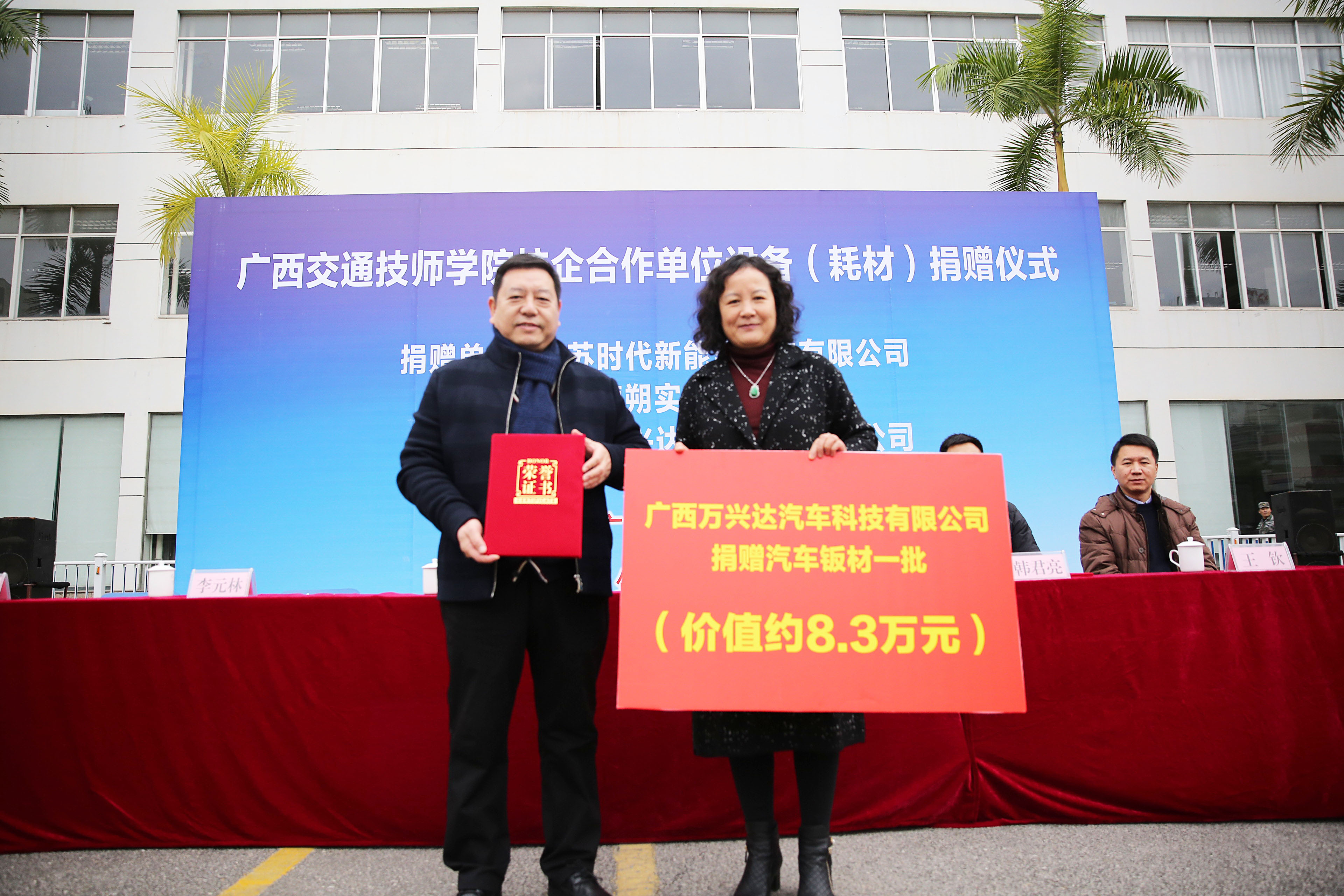 在此次捐贈儀式上(shàng),分別(bié)有江蘇時代新能源科技有限公司和南京德朔實業有限公司向我院捐贈了3台新能(néng)源(yuán)教學用(yòng)車,廣西萬興達汽(qì)車科技有限公司向我院捐贈了一批價值約8.3萬元的汽車鈑金實訓耗材(cái)。學院接受了企業的捐(juān)贈,並為企業頒發了捐贈證書。