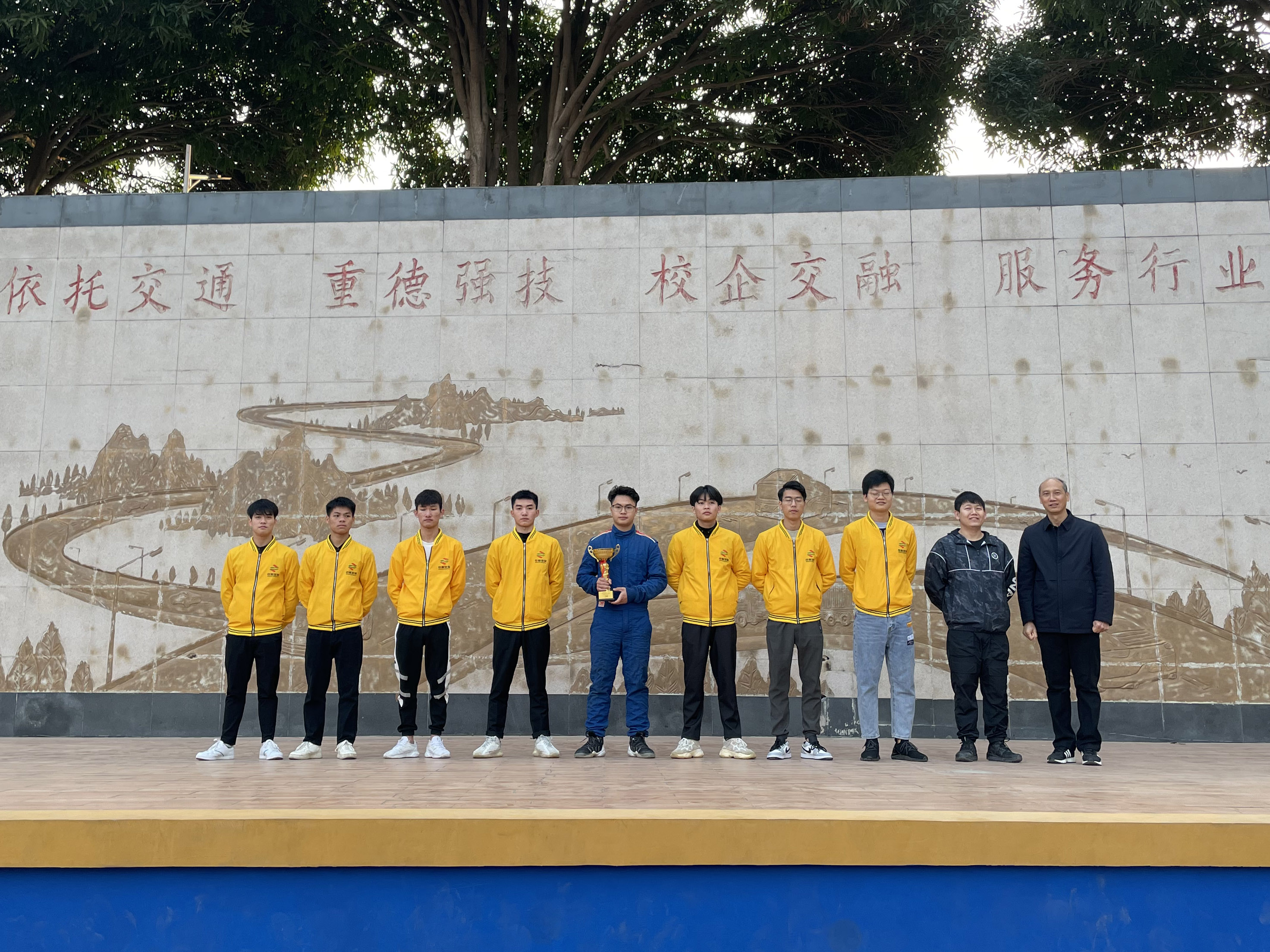 學院(yuàn)副院長關菲明與學院獲獎車隊(duì)(精品欧美一区二区在线看片技師(shī)學院戰路者車隊)代表合影