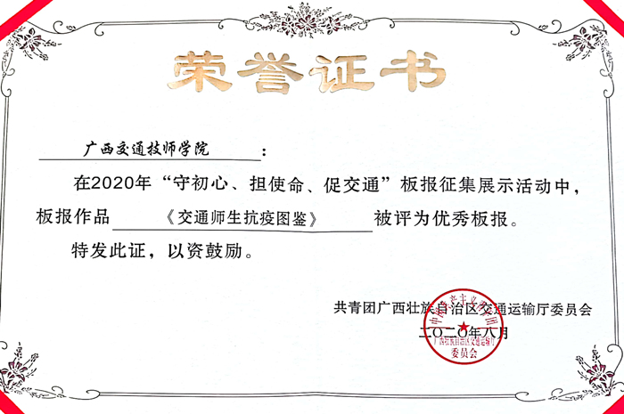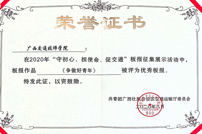 共青團廣西壯(zhuàng)族自治區交通(tōng)運輸廳委員會舉辦了2020年“守初心、擔使命、促交通”板報比賽,我院團委選送的參賽作品《爭做好青年》和《交通師生抗疫圖鑒》榮獲本次比賽的“優秀板報”獎。