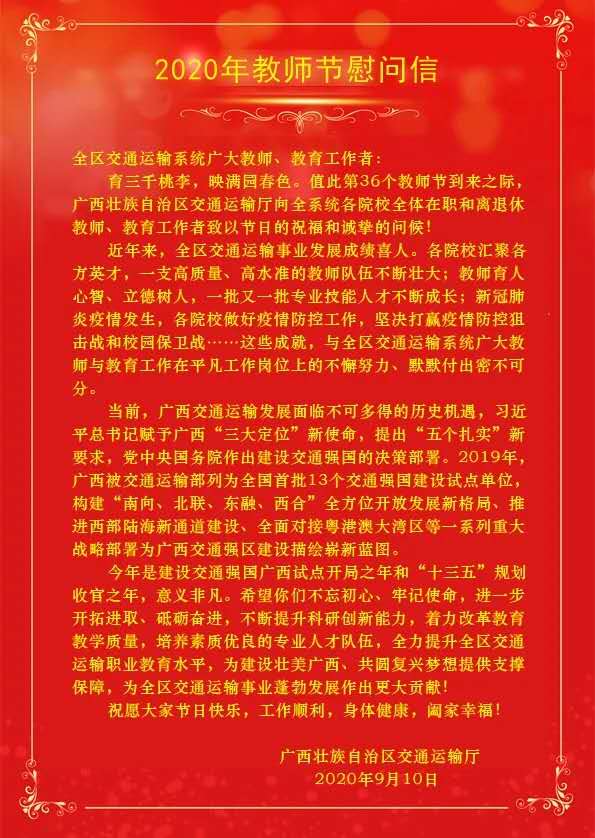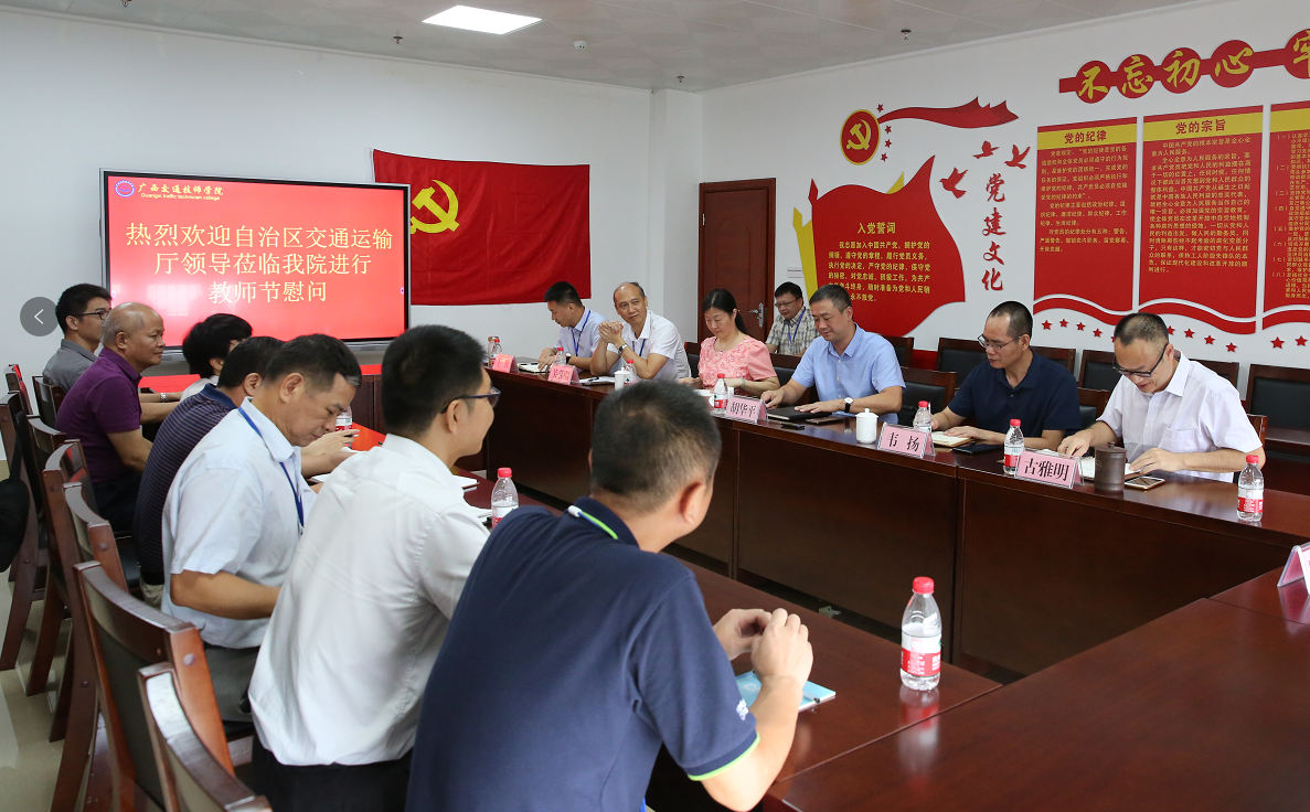 9月(yuè)9日上午,第36個教師節到來(lái)之際,自治(zhì)區交通運輸廳副(fù)廳長胡華(huá)平、科教處副處長韋揚、副調研員張迎春蒞臨我院開展教(jiāo)師節慰問活動並(bìng)召開教師(shī)座談會(huì)。學院領導班子及部分優秀(xiù)教師代表參(cān)加了座談會。