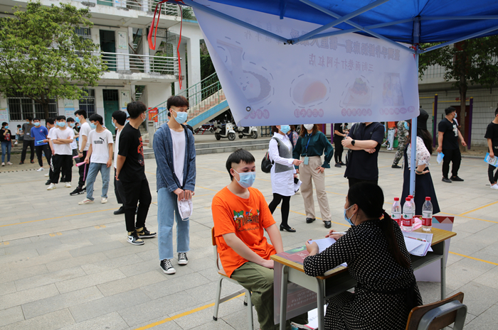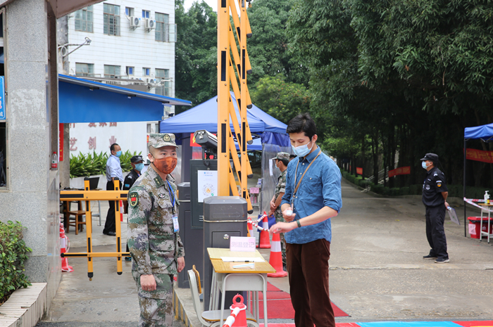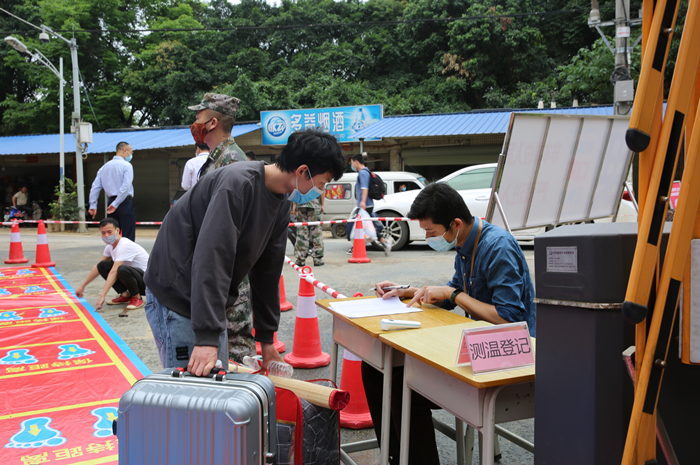 返校學生(shēng)在校大門(mén)處接受體(tǐ)溫檢測並進(jìn)行信息登記