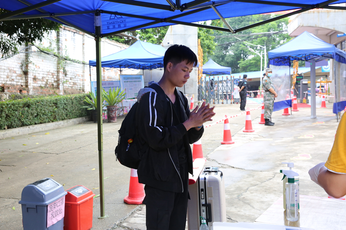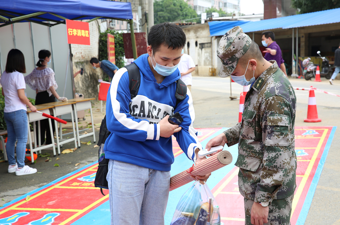 返校(xiào)學生抵達,由學院相關工作(zuò)人員引(yǐn)導入校,為確保學(xué)生(shēng)健(jiàn)康,在(zài)各相關部門之間的工作合(hé)力下,入校流程層(céng)層把(bǎ)關,經過行(háng)李消殺、查看證件及(jí)健康碼、測量體溫、信息登記、雙手消毒、更(gèng)換發放新口罩等流程(chéng)後進入校園。