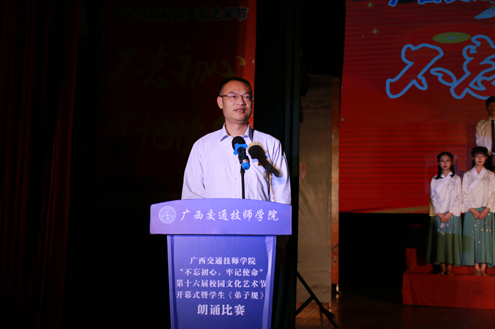 鍾修仁院長在開幕式上對本屆校園文化藝術節的成功舉辦表示熱烈祝(zhù)賀,並代表學院領導班子對籌備(bèi)本屆文(wén)化藝術(shù)節的師生致以(yǐ)誠摯的謝意。他表示,為了深入開(kāi)展愛國主義教育和革(gé)命傳統文化教育(yù),促進學院校園文化建設,增強廣大師生“不忘初心,牢記使命”的(de)政治理想信(xìn)仰,本屆(jiè)校園文化藝術節以“不忘(wàng)初心,牢記使命”為主題,開展教職工書畫藝術展、學生《弟子(zǐ)規》朗誦比賽、技師“金話筒(tǒng)”主持人比賽等係列活動。我院學子積極(jí)參與,表現優良,充分展現了我院師生對藝(yì)術(shù)的不倦追(zhuī)求和銳意進取的良好精神風貌。