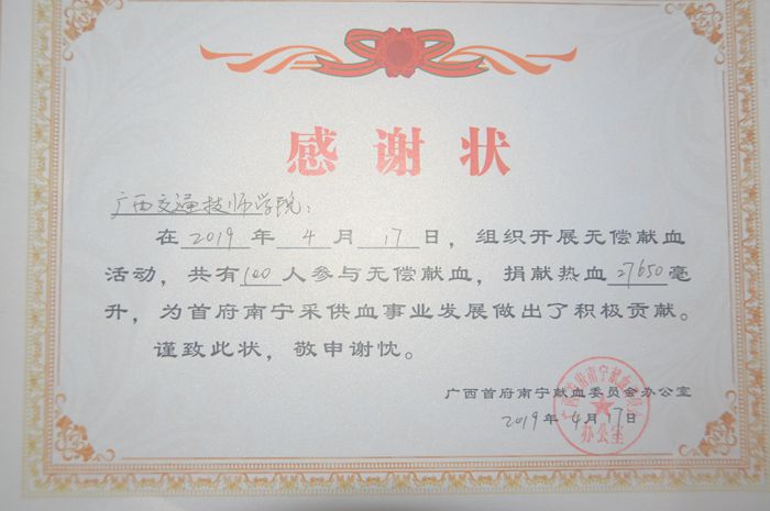 此次活動持續到晚上將近7點,得到了廣大同學的積極響(xiǎng)應,據(jù)統計共有100名師生參與了無償獻(xiàn)血,獻血27650毫升,展現了(le)我院師生的熱情與愛心,為首府南寧采供血事業發展做出了積(jī)極貢獻。我院從2006年開始(shǐ),每年都(dōu)組織愛心獻血活動,由此也連續十(shí)二年被廣西首府南寧(níng)獻(xiàn)血委員會評為駐(zhù)邕大中專院校(xiào)無償獻血促進(jìn)單位,是(shì)駐邕中(zhōng)職(zhí)院校唯一一所獲得此殊榮的學校。