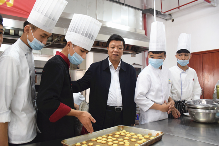 西式麵點比(bǐ)賽的(de)選手向鍾修仁院長介(jiè)紹自己的參賽作品