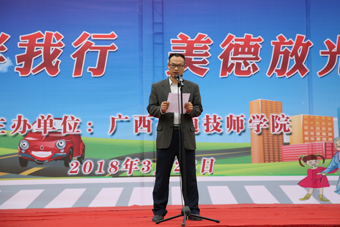 古雅明書記為活動致辭,他表示,我院(yuàn)自2013年創建了(le)全國第一(yī)所安全節能(néng)文明駕駛公益學校,並逐步建成了開放公益大課堂、駕(jià)駛員(yuán)綜合能力測評、網絡服(fú)務、文明駕駛教育示範等(děng)4個窗口基地。這些基地(dì)的(de)建成,使安全節能文明駕駛滲透人心,促進了我院和行業主管部(bù)門、企事業單(dān)位的共同關注(zhù)安全節能文明駕駛公益傳播事業,造就了一支通曉安全、節(jiē)能、文明駕駛知識的多樣(yàng)化師資隊伍(wǔ),形成了富有行業特(tè)色的安(ān)全節能文(wén)明駕駛公益文化。2017年,我院成為全國唯一一所榮獲“首屆全國文(wén)明校園”至高榮譽的全日製(zhì)技工類院校,也是廣西唯一一所獲此殊榮的中(zhōng)職院(yuàn)校。古雅明書記希望我院師生共同珍(zhēn)惜、維護這份來(lái)之不易的榮譽,加(jiā)強文明素養、文明習慣的養成,通過本次公益(yì)大課堂活動,牢固樹立“人(rén)人需要文明(míng)交通,交通需要人人文明”的交通安全理念,鞏固全國(guó)文明校園建設成果。