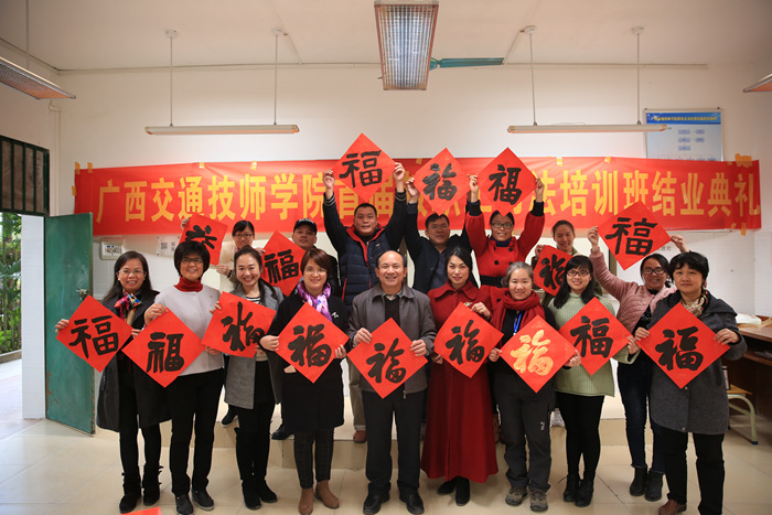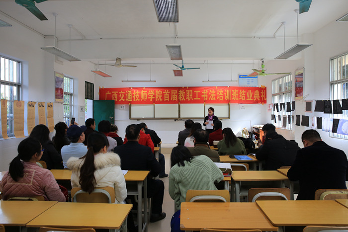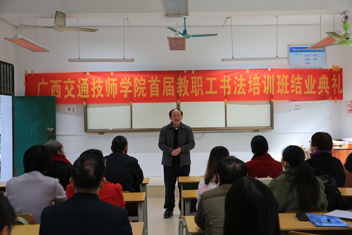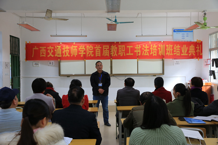 為豐富我院教職工文化生活,進一步傳承和發揚書法這一中華民族傳統文化瑰寶,同時培養(yǎng)一批書法(fǎ)課程教(jiāo)師,學院決(jué)定於2017年11月開設教職工書法培訓班。經過兩個多月的學(xué)習,培訓班的(de)23名學員於2018年1月12日順利結課,並在求學樓104教室舉行了學員書(shū)法作品展示暨結業儀式(shì)。我院院長助理樊海(hǎi)林,著名書法家黃大業先生、馮蕊女士及培訓班學員出席了結(jié)業典禮。