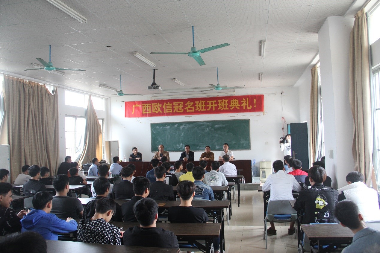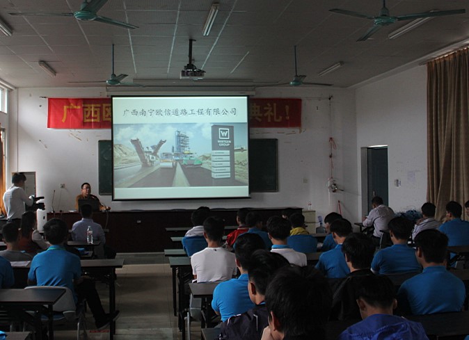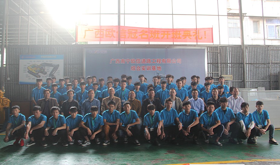 開班揭牌儀(yí)式結束後,廣西南寧歐信道路工程有限公司總經理黃敏為歐信機械班全體學生上了生動的第一課,向(xiàng)大家介紹了歐信的發展過程和企(qǐ)業文化。作為同學們的學長,黃敏總經理以其自身經曆鼓勵大家要有夢想,要有抱負,要通過不斷努力和奮鬥來實現自己的人生價值(zhí)。