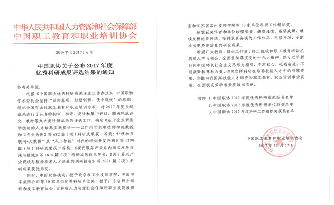 近日,根據中國職工教育和(hé)職業培訓協會《中國職協關於公布(bù)2017年度(dù)科研成果評選結果的通知 》(職會字20176)文件獲悉,我院(yuàn)報送的14項成果(guǒ)全部獲獎,其中(zhōng),一等獎4項,二等(děng)獎2項,三等獎5項,優(yōu)秀獎3項。