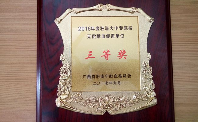 喜訊!2017駐邕(yōng)大中專(zhuān)院校無償獻血工作會議於9月(yuè)28日在南寧市桃源飯店會議廳進行,我院榮獲2016年度駐(zhù)邕大中專(zhuān)院校無償獻血促進單位三等獎的殊榮。