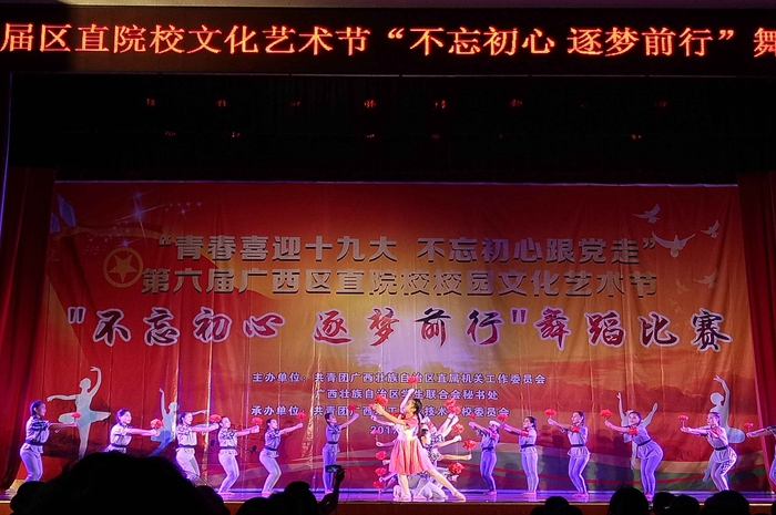 6月13日14:30,由共青團廣西壯族(zú)自治區直屬機關工作委員會和(hé)廣西壯族自治區學生(shēng)聯合(hé)會秘書(shū)處主辦,共(gòng)青團(tuán)廣(guǎng)西理工職業技(jì)術學校委員會(huì)承辦的(de)“青春喜迎十九大 不忘初心跟黨走”第六屆廣西區直院校校園文化藝術節“不忘初心 逐夢前行”舞蹈比賽在廣西理工職業技術學校風華(huá)禮堂舉行,共有(yǒu)16所中職院校參加。我院學生舞蹈《映山紅》參加了此次比賽。