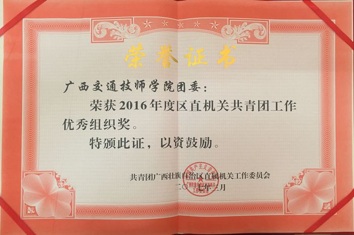 2016年,我院團委在學院(yuàn)黨(dǎng)委和學院領導的關懷和幫助下,主動承(chéng)擔、保質保量地(dì)完成團區委和區直團工委交辦的任務,為(wéi)區直機關(guān)共青團(tuán)的創新發展貢獻了自(zì)己的力量(liàng),獲得了年度區直機關共青團工作“優秀組織獎”,並且我院是連續三年獲此殊(shū)榮的中職院校。