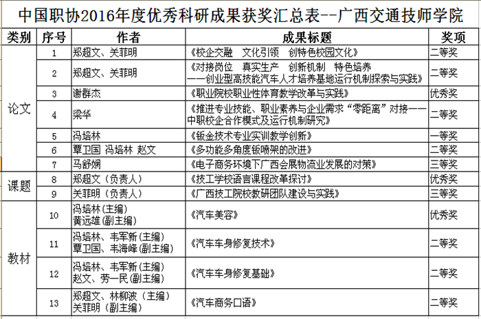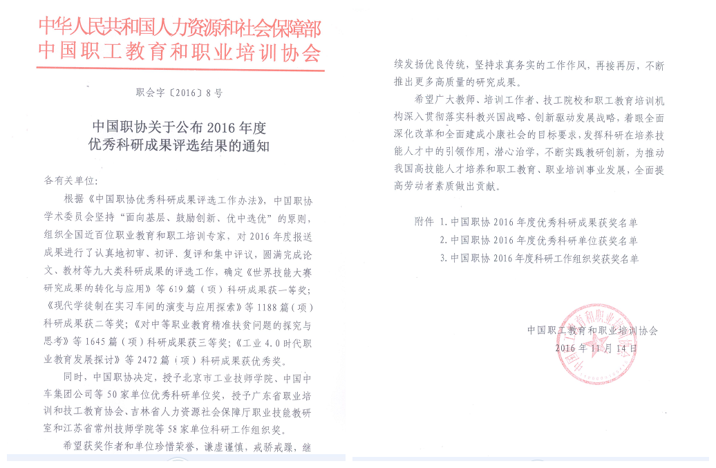 近日,根據中國職工(gōng)教育和職業培訓協會《中國職協關於公布2016年度優秀成果評選結果的通知》(職會字[2016]8號(hào))文件獲悉,我院選送的14個成果中有13個(gè)獲獎,其中,一(yī)等獎1個、二(èr)等獎7個、三(sān)等獎2個(gè)、優秀(xiù)獎3個。