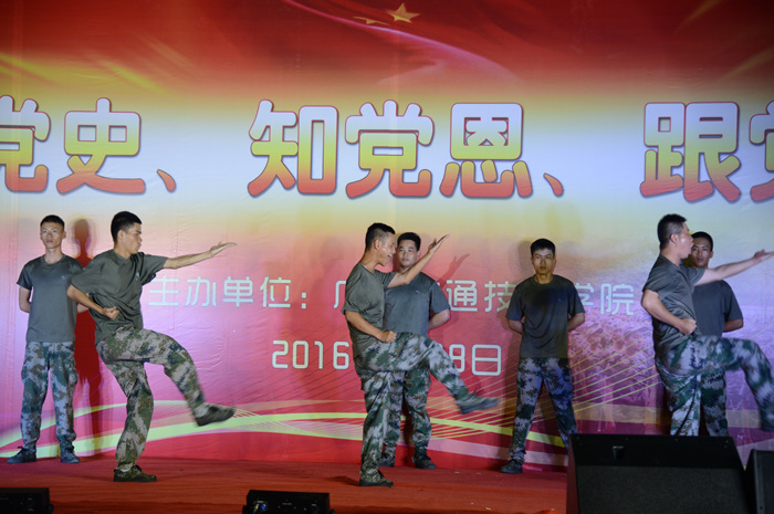 晚會在學院音樂(lè)協(xié)會一首熱烈的《離開地球表麵》中拉開帷幕。長堽校區啦啦操協會表演《青春(chūn)旋律》,朝氣蓬勃、活力四射;新班主任代表李桀熹一(yī)首獨唱《兵》,表達了對官(guān)兵們的(de)無限崇敬;教官代表們表演(yǎn)的軍體拳,陽剛有力、威武帥氣。晚會節目精彩紛呈,現場氣(qì)氛不時爆發出陣陣掌聲。