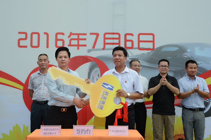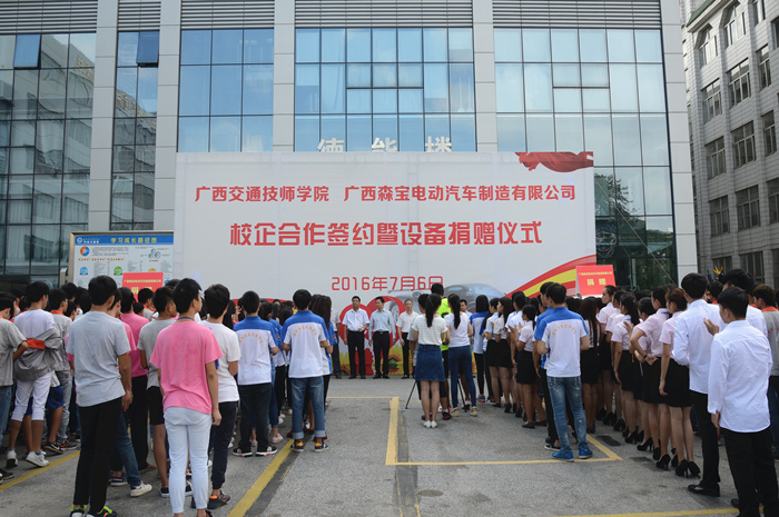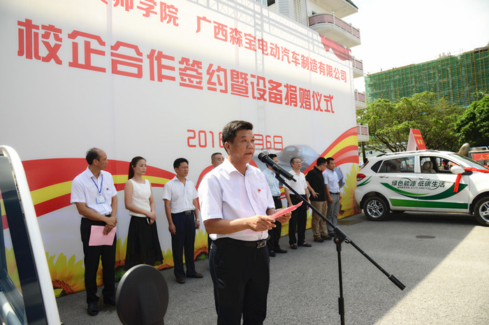 隨(suí)後,雙方代表簽訂了校(xiào)企合作協議,廣西森寶電(diàn)動汽(qì)車製造有限公司在現場向我院捐贈了新能源汽車。