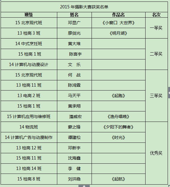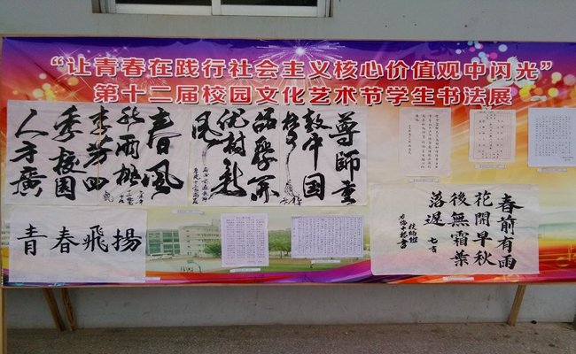 2015年11月,我院開展了(le)“讓青(qīng)春在踐行社會(huì)主義核心價值觀(guān)中閃光”學生書畫攝影比賽並進(jìn)行展出。比賽(sài)在全院進行,共收得學生書法作品(pǐn)118幅,繪畫作品128幅,攝影作品140幅;並分別評比出了書法比(bǐ)賽(sài)一等獎兩名,二(èr)等獎三名,三等獎(jiǎng)五名,優秀獎五名。繪畫比賽一等獎兩名,二等獎三名,三等級(jí)五名,優秀獎五名。攝影比賽一等獎兩名,二等獎三名,三等獎五名,優秀獎六名。