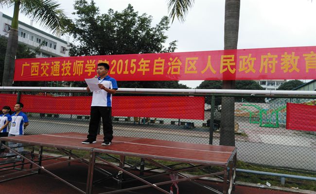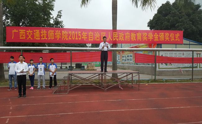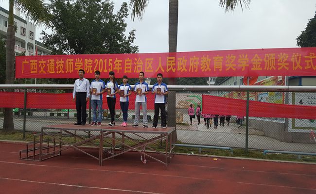 11月23日早上, 2015年度(dù)自治(zhì)區(qū)人民政府教育獎學金頒獎儀式在我院足球場隆重舉行。頒獎儀式由我院學(xué)生工(gōng)作處副主任梁勇主持,學院院長鍾修(xiū)仁、學生工作(zuò)處領導、全體幹事、各(gè)班(bān)主任及(jí)在校班級全體學生出席會議(yì)。我(wǒ)院(yuàn)共(gòng)有190名(míng)學(xué)生榮獲2015年度自治區人民政府教育獎學金,每人2000元,共計38萬元人民(mín)幣。