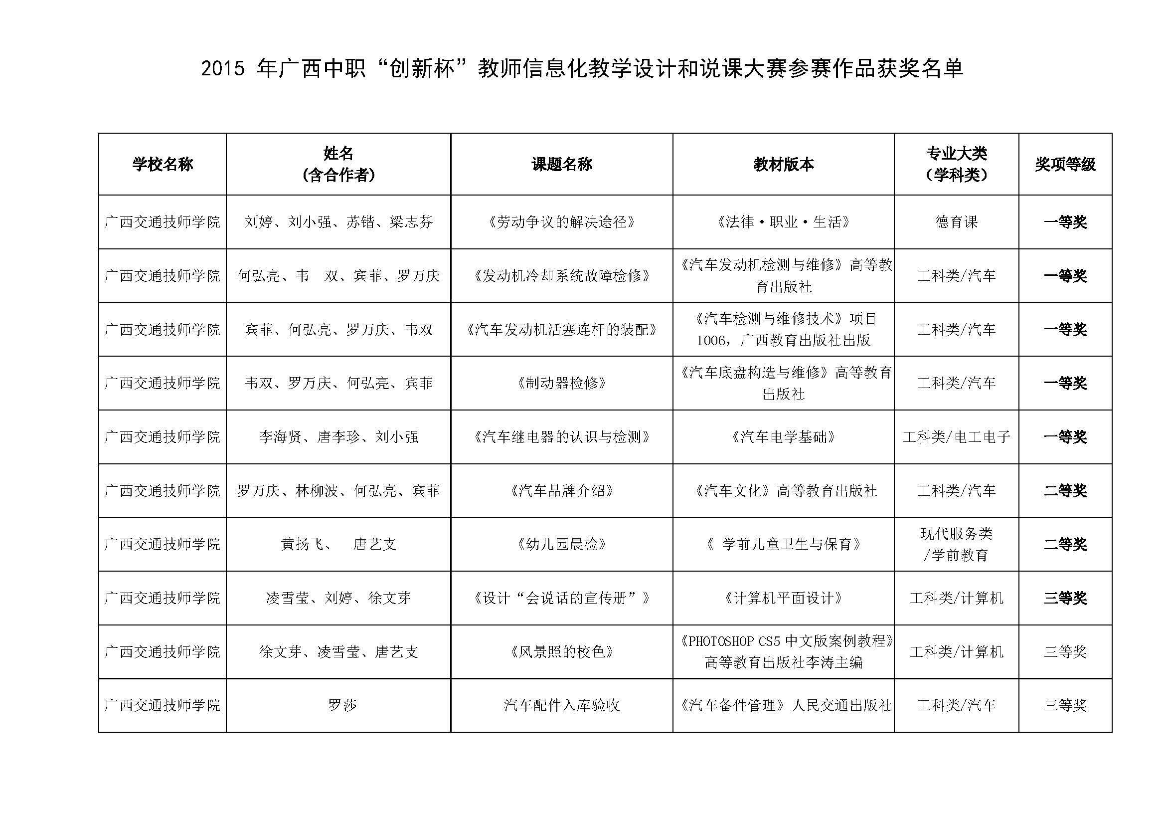 本次大賽由廣西中等職業教育教學改革指導中心組織,旨在提升中職院(yuàn)校教師應用現代化教育技術手段和數字化資源能力,促進教師素質和教學質量的提高(gāo),選拔優秀作品和教師參加2015年全國中等職業學(xué)校“創新杯”教師信息化教學設計和說(shuō)課大賽。本次大賽中,全區共45所(suǒ)中(zhōng)職院校,226個作品參加比賽,經過激(jī)烈的角逐(zhú),我校選(xuǎn)送的12個作品中共有10個作品獲獎,分別為:一等獎五項,二等獎兩項,三等獎(jiǎng)三項。其中《勞動爭議的解決途徑》、《發動機冷卻係統故障檢修》、《汽車(chē)發動機活塞(sāi)連杆的裝配》、《製動器檢修》、《汽車繼電器的認識與檢測》、《汽車品牌介紹》等6個(gè)作品入選廣西集(jí)訓隊;何弘亮、賓(bīn)菲、韋雙、劉婷4位老師經(jīng)過(guò)集訓隊(duì)的(de)嚴格培訓和甄選,最終脫穎而出,成功晉級國賽隊,並將於10-11月參加全國總決賽(sài)。