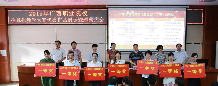 6月28日下午,由廣西教育廳主辦,廣西高校教育技(jì)術專業委員(yuán)會和廣(guǎng)西經貿職(zhí)業技術學院承辦的2015年廣西職業院(yuàn)校信息化大賽,在廣西經貿職業技術(shù)學院頒獎(jiǎng)大會落下帷幕。我校淩雪瑩、何洪亮代表我院獲獎教師(shī)參加頒獎儀式。