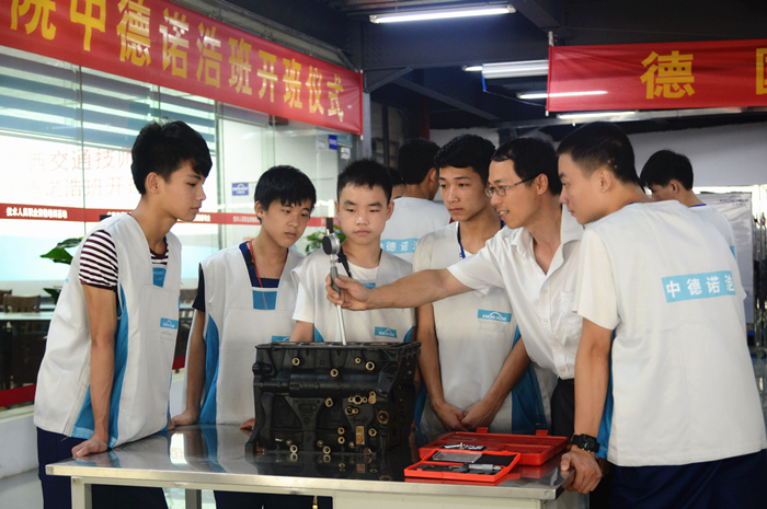 中德諾(nuò)浩(hào)汽車職教課程是引進德(dé)國汽車職業教育資源,結合我國實際研製開發的(de)一套適合我國國情的高素質、高技能汽車人才培養體係。其最大特點是,通過引進德國雙元製的(de)課程體(tǐ)係和辦學模式,培養具有掌握汽車機(jī)電診斷與維修技術的汽車醫生,以及掌握汽車新(xīn)技術、具備國際服務(wù)理念(niàn)的新一代高素質、高技能汽(qì)車專門人才。所有專業課程全部(bù)在(zài)與教材匹配(pèi)的汽車實訓室進行(háng),學生在課堂上即可直接學習(xí)到企業工作(zuò)一線的實際(jì)案例,並按照企(qǐ)業(yè)工作(zuò)流程進行實操訓練,使其在校期間即(jí)能學到企業所(suǒ)需技能。