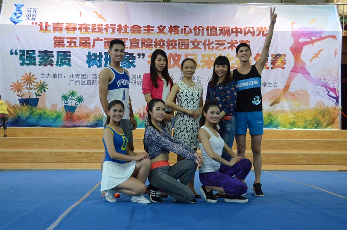 5月9日下午,第五屆(jiè)區直(zhí)院校校園文化藝術節“強素質 樹形(xíng)象”禮儀風采比賽中職組總決賽在廣西機電職業技術學院體育館進行。經過初賽(sài)的角逐,共有10個學校的代表隊進入決賽,每支代表隊的人數為5人,每隊由(yóu)三女兩男組成(chéng)。決賽由禮儀裝展示與團隊介紹和團隊個性(xìng)服裝展示兩部分組成。在信息與商務係的劉飛英老師(shī)、周麗麗老師和陳蕾旭三位老師的帶領下,13汽車維修與鈑金中(zhōng)級工1班覃冰、14西式烹飪班黎東明、13高速公路(lù)服務班羅菲雲、趙思琪、李嵐(lán)五位同學組成(chéng)了我院代表隊參加(jiā)決(jué)賽。