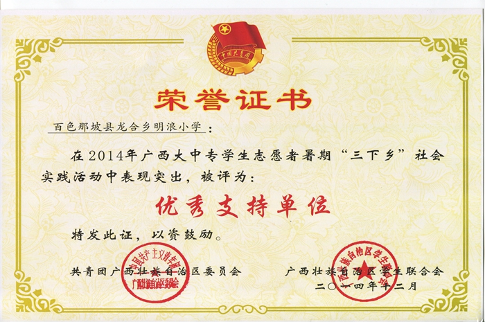 2014年自治區黨委宣傳(chuán)部、自治區文明辦、自治區教育廳、共(gòng)青團廣西區委、廣西學聯組織開展全區2014年大中專學生誌願者(zhě)暑期(qī)“三下鄉(xiāng)”社會實踐活動評比表(biǎo)彰活動,評比出一批(pī)優秀(xiù)組織獎、優秀指導教師、先進個人、優秀支持單位。