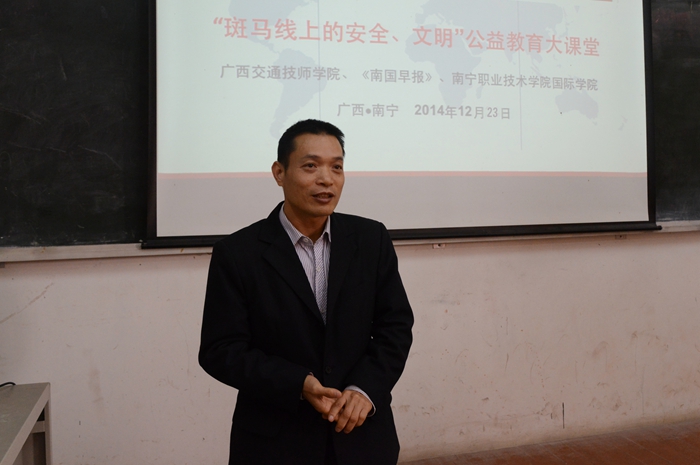 12月23日(rì),由我院主辦,以(yǐ)“傳播公益,文明你我(wǒ)”為主題的安(ān)全節能文(wén)明駕駛公益教育(yù)大課堂廣西高校行宣傳活動在南寧職(zhí)業技師學院國際(jì)學院拉(lā)開序幕(mù)。本次活動得到了南寧(níng)職業技術學院的重視以及《南國早報》等新聞(wén)媒(méi)體的(de)關注與支持,南寧職業技術學院(yuàn)國際學(xué)院黨委書(shū)記、院長許康平,副書記、副(fù)院(yuàn)長包虹明出席了此次活動,南寧職業技術學院100多名師生到場聽課(kè)。