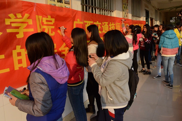 師生們紛紛在橫幅上簽字留言