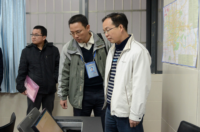 龐福生書記(右一)來到運升駕校駕駛員考試(shì)操作機房了解相關考試和培訓情況